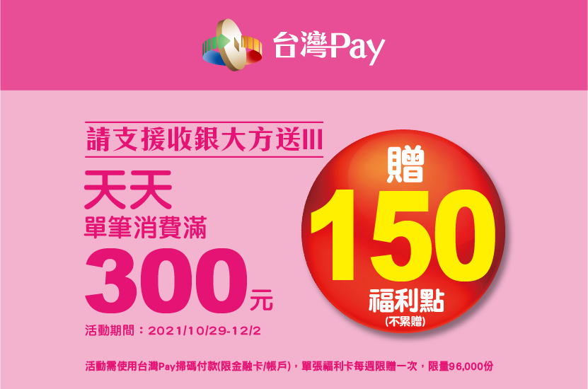 - 活動內容:全聯福利卡會員於活動期間至「全聯福利中心」各門市,使用「台灣Pay」單筆消費滿新臺幣(以下同)300元(含)以上,即可享福利卡福利點150點回饋(單筆不累贈),單張福利卡每週限回饋一次。